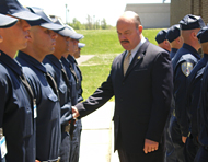 Drills complete, the candidates stand at attention as State Sen. Fred Madden, a Glassboro State College alumnus and interim director of the police academy in Sewell, evaluates them head to toe.